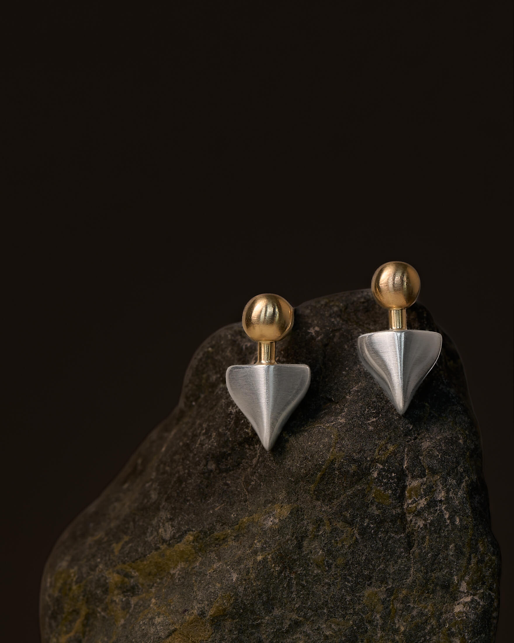 Handcrafted in solid recycled 9ct gold and silver, the Saorsa Drop Studs are inspired by Scotland’s antique jewels, with clean, considered forms and a sculptural presence for effortless wear from day into evening.