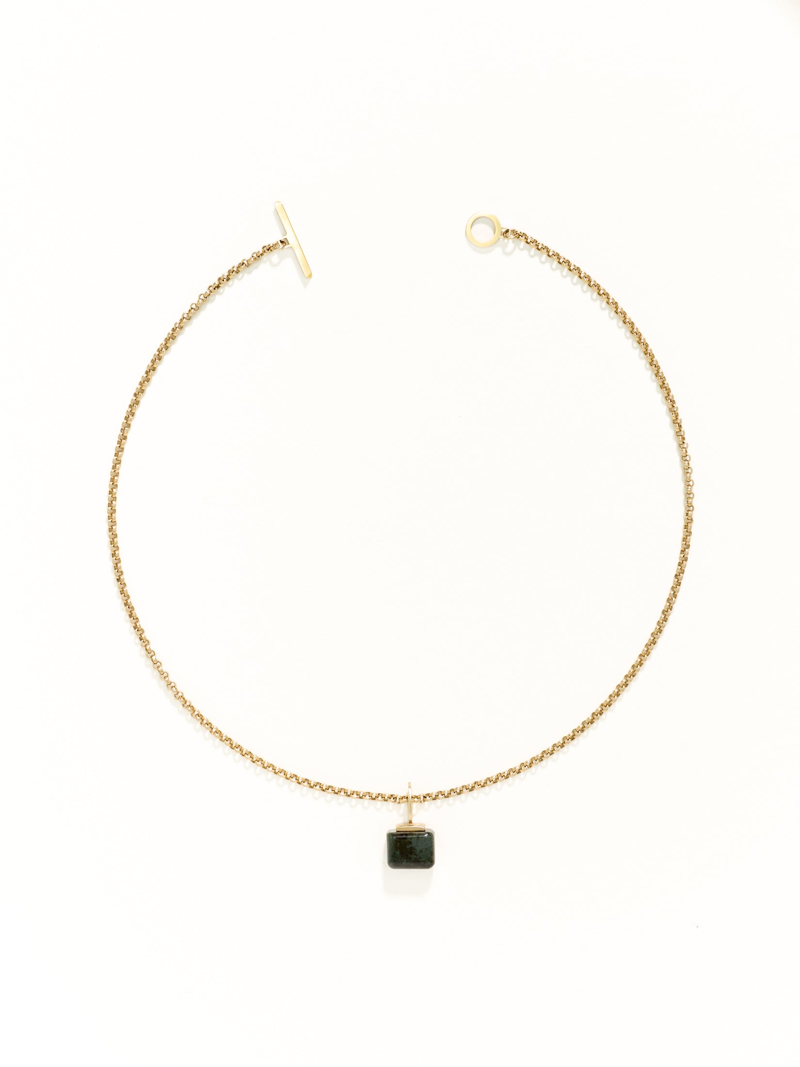 A one-of-a-kind pendant and the first bloodstone piece for Tarska Jewellery, this design combines the rich, deep green of Scottish Bloodstone from the Isle of Rum with recycled 9ct gold.