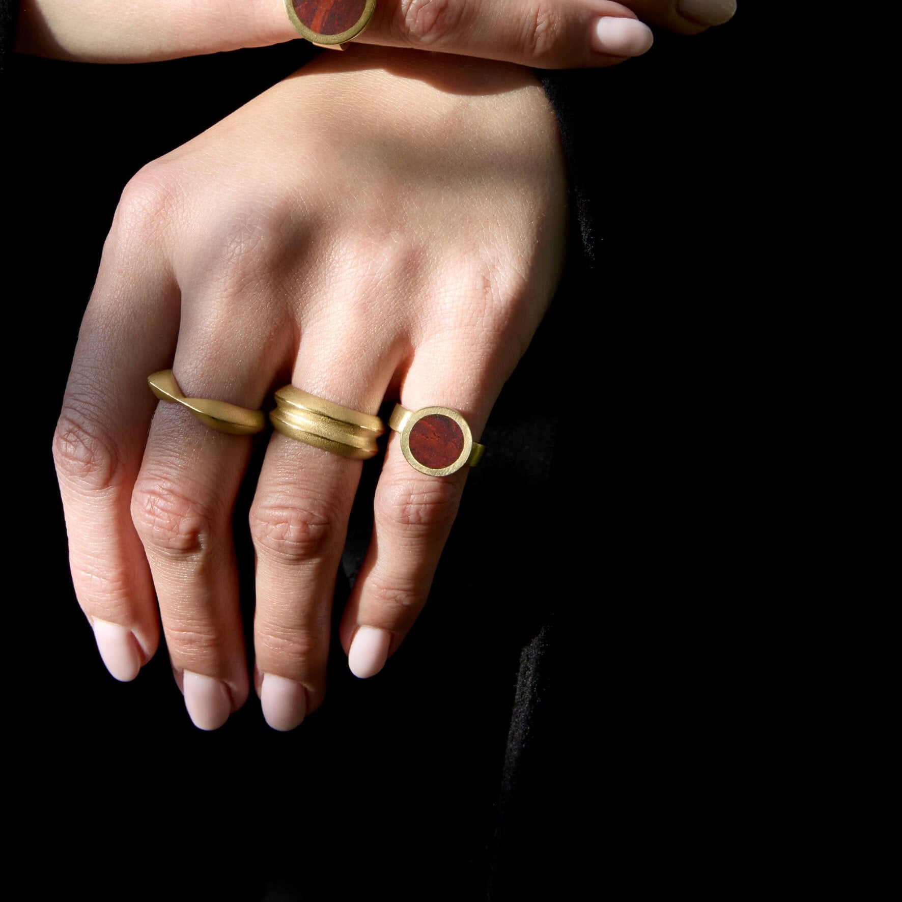 A harmonious blend of chunky recycled gold and Scottish Red Jasper, mindfully hand-collected from the idyllic beaches along Scotland’s east coast near Fife and Montrose. Each stone has its own unique character, making your ring truly one-of-a-kind.
