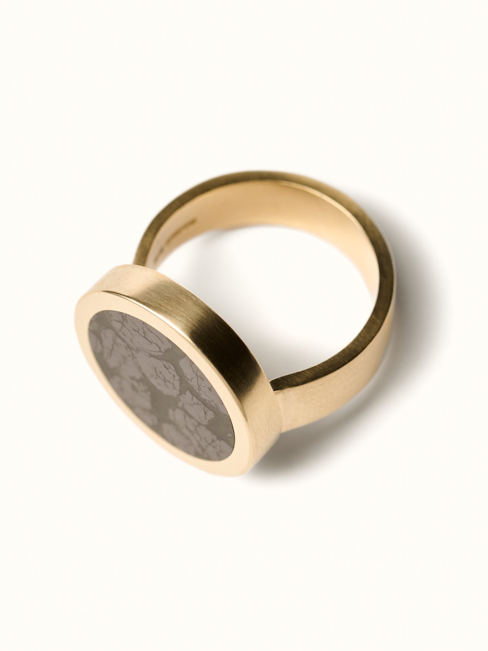 Sourced from the lowland hills of Scotland, this rare crystal rock is marked by its distinctive leopard-print patterning. Set in chunky recycled gold, the piece holds a dark, enigmatic spinel crystal with the quiet character of the land it came from. Each stone is cut and polished by hand here in my workshop.